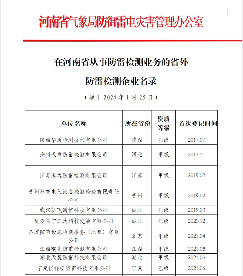 在河南省從事防雷檢測(cè)業(yè)務(wù)的省外